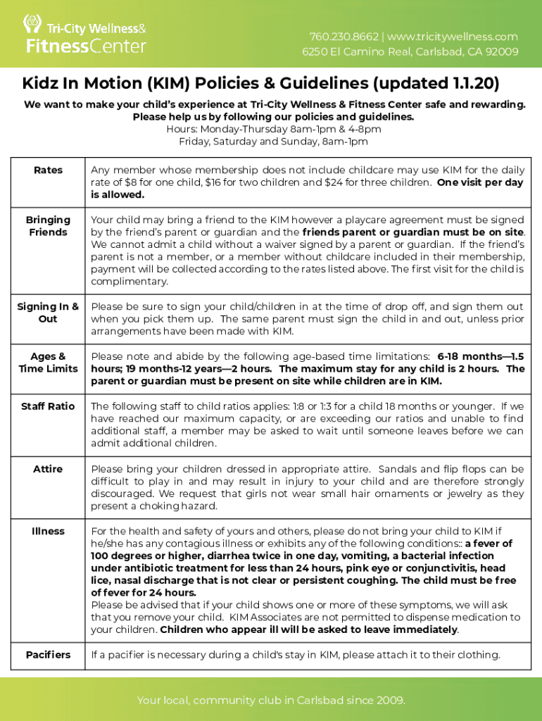 760.230.8662 | www.tricitywellness.com 6250 El Camino Real, Carlsbad, CA 92009Kidz In Motion (KIM) Policies & Guidelines (updated 1.1.20) We want to make your children experience at Trinity Wellness