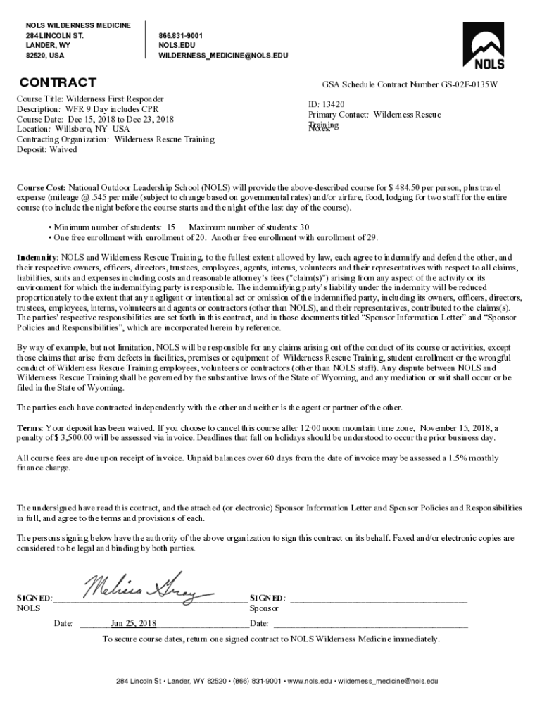 VOLS WILDERNESS MEDICINE 284 LINCOLN ST. LANDER, WY 82520, USA866.8319001 VOLS.EDU WILDERNESS_MEDICINE@NOLS.EDUCONTRACTGSA Schedule Contract Number GS02F0135WCourse Title: Wilderness First Responder