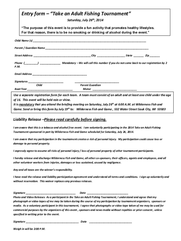 Entry form Take an Adult Fishing Tournament Saturday, July 26th, 2014 The purpose of this event is to provide a fun activity that promotes healthy lifestyles. For that reason, there is to be no smoking
