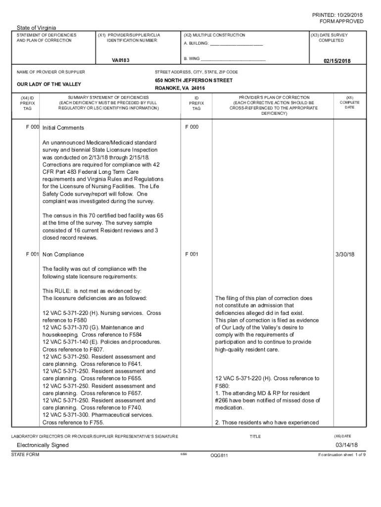 PRINTED: 10/29/2018 FORM APPROVEDState of Virginia STATEMENT OF DEFICIENCIES AND PLAN OF CORRECTION(X1) PROVIDER/SUPPLIER/CIA IDENTIFICATION NUMBER:OUR LADY OF THE VALLEY (X4) ID PREFIX TAG. BUILDING: