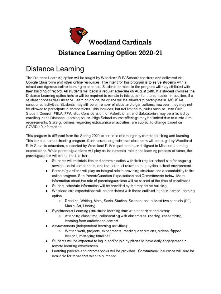 Woodland Cardinals Distance Learning Option 202021Distance Learning The Distance Learning option will be taught by Woodland RIV Schools teachers and delivered via Google Classroom and other online
