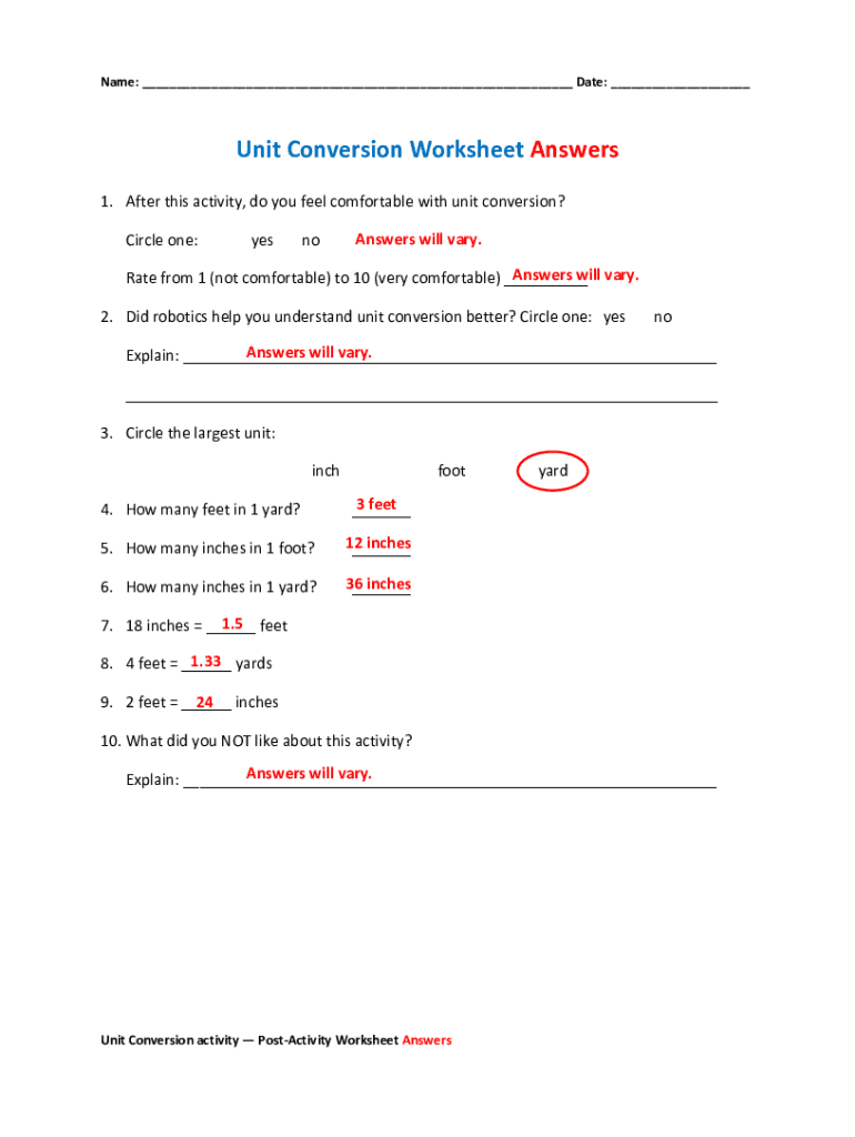 Name: ___ Date: ___Unit Conversion Worksheet Answers 1. After this activity, do you feel comfortable with unit conversion? Circle one:yesnoAnswers will vary. Answers will vary. Rate from 1 (not comfortable)