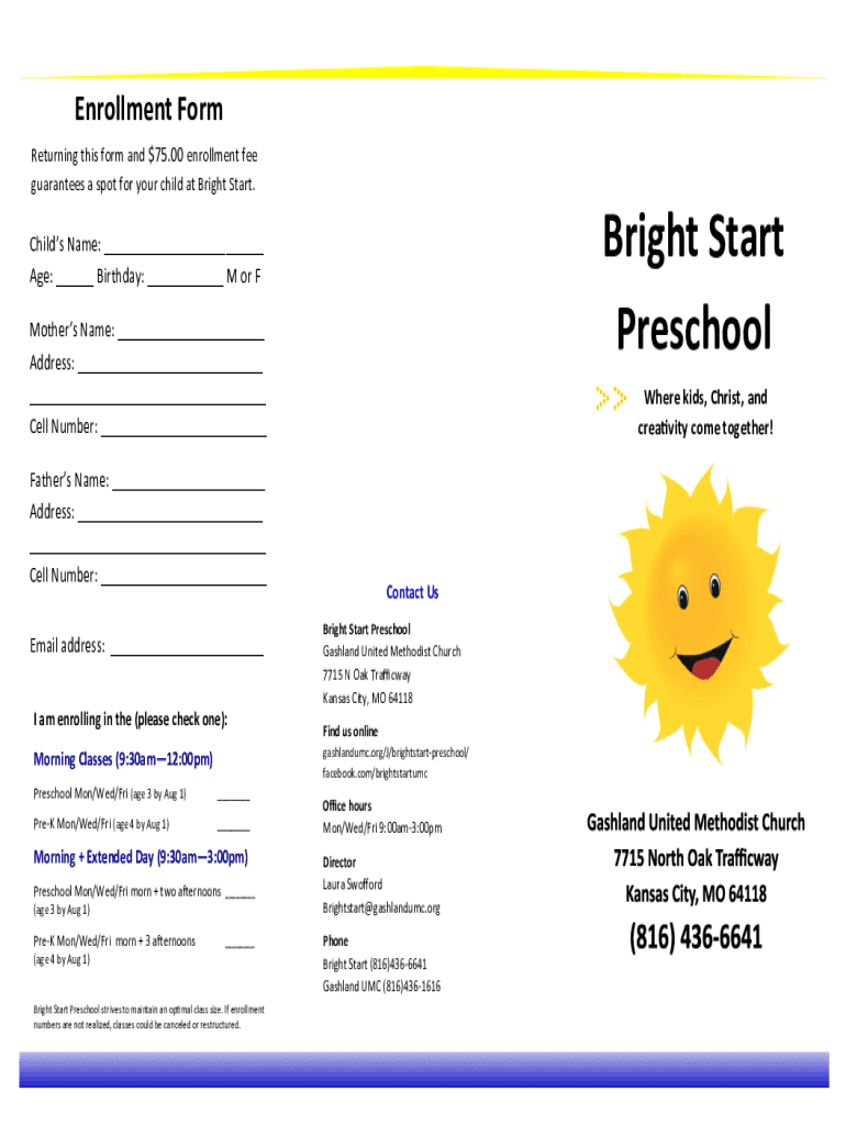 Enrollment Form Returning this form and $75.00 enrollment fee guarantees a spot for your child at Bright Start. Bright Start PreschoolChilds Name: ___ Age: ___ Birthday: ___ M or F Mothers Name: ___