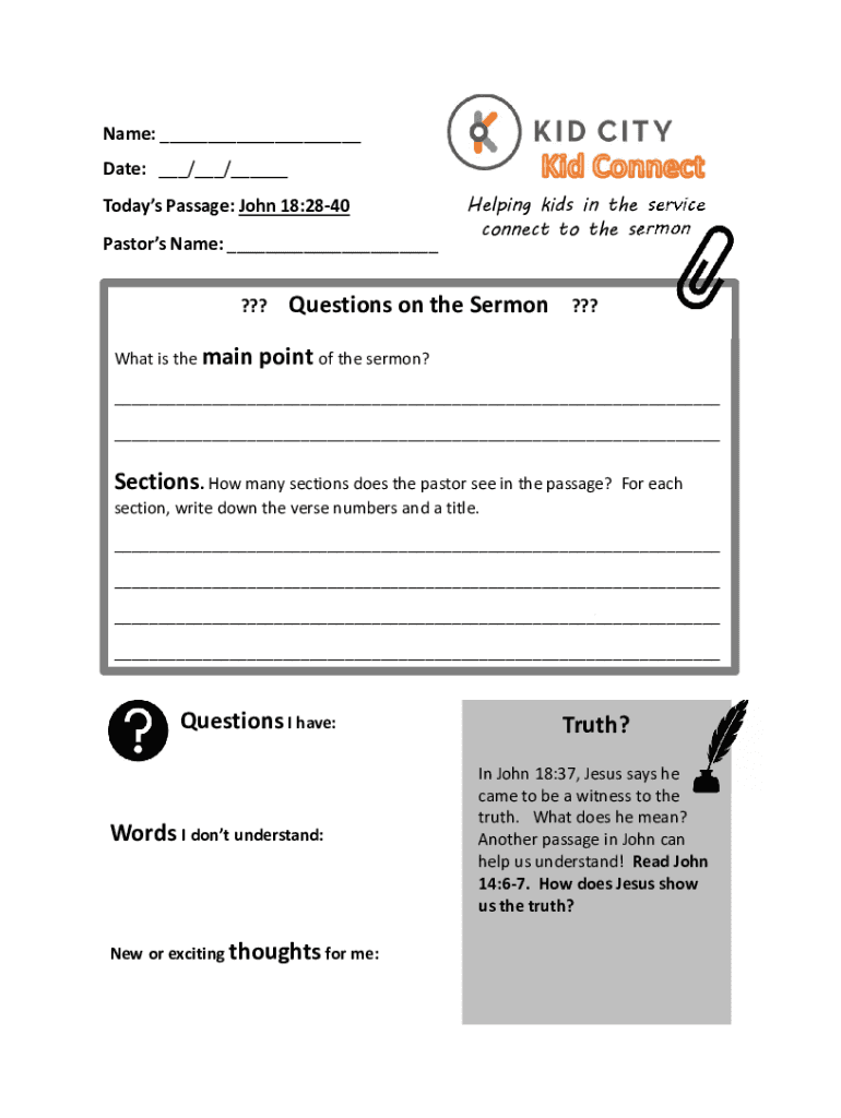Name: ___ Date: ___/___/___ Today's Passage: John 18:2840 Pastors Name: ___ ??? What is the mainHelping kids in the service connect to the sermonQuestions on the Sermon???point of the sermon?___ ___Sections.