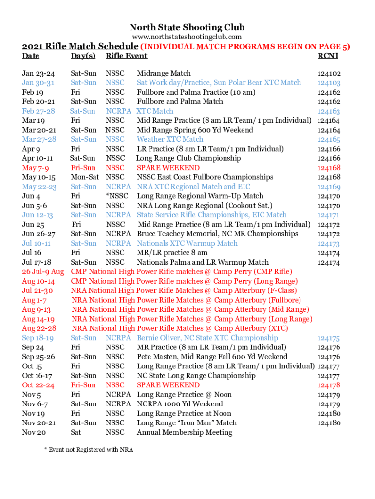 North State Shooting Club www.northstateshootingclub.com 2021 Rifle Match Schedule (INDIVIDUAL MATCH PROGRAMS BEGIN ON PAGE 5) Date Day(s) Rifle Event RCN Jan 2324 Jan 3031 Feb 19 Feb 2021 Feb 2728