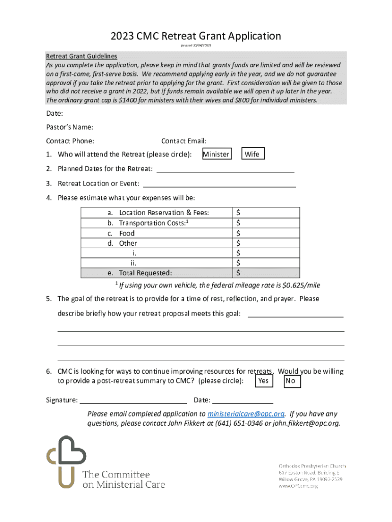 2023 CMC Retreat Grant Application (revised 10/04/2022)Retreat Grant Guidelines As you complete the application, please keep in mind that grants funds are limited and will be reviewed on a first come,