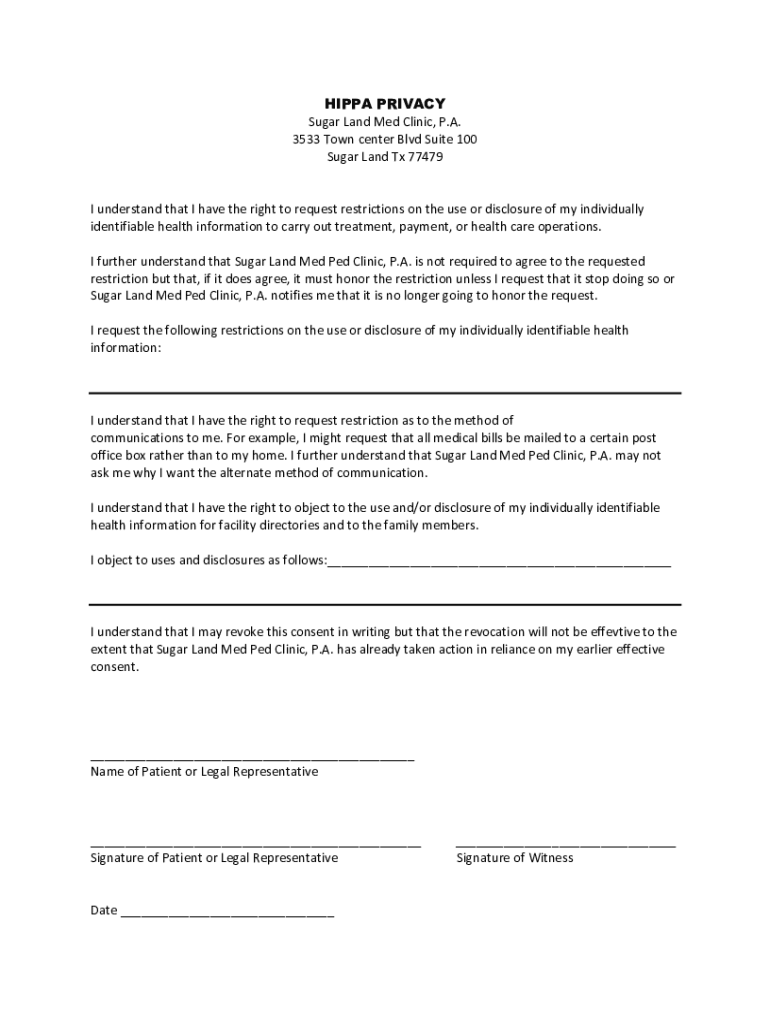 HIPPO PRIVACY Sugar Land Med Clinic, P.A. 3533 Town center Blvd Suite 100 Sugar Land TX 77479I understand that I have the right to request restrictions on the use or disclosure of my individually