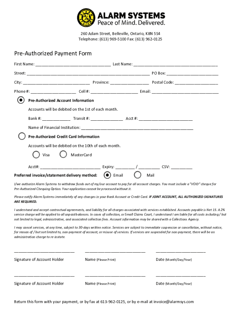 260 Adam Street, Belleville, Ontario, K8N 5S4 Telephone: (613) 9695100 Fax: (613) 9620125PreAuthorized Payment Form First Name: ___ Last Name: ___ Street: ___ PO Box: ___ City: ___ Province: ___ Postal