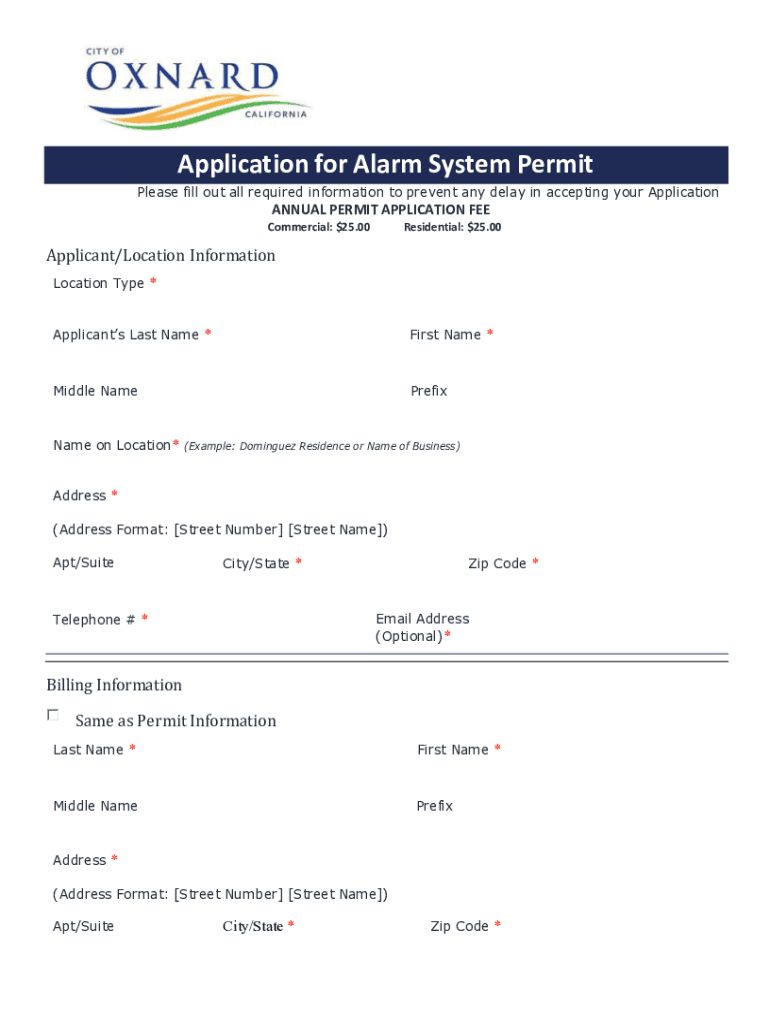 Application for Alarm System PermitPlease fill out all required information to prevent any delay in accepting your ApplicationANNUAL PERMIT APPLICATION Commercial: $25.00Residential: $25.00Applicant/Location InformationLocation