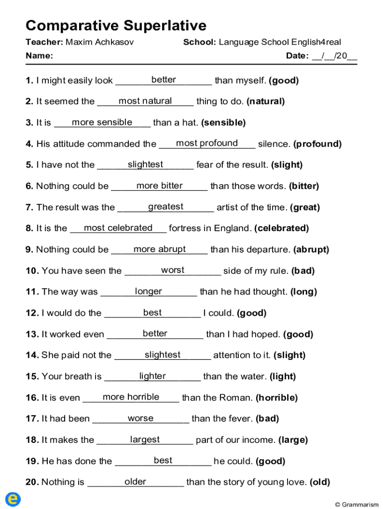 Comparative Superlative Teacher: Maxim AchkasovSchool: Language School English4realName:Date: __/__/20__better 1. I might easily look ___ than myself. (good) most natural 2. It seemed the ___ thing