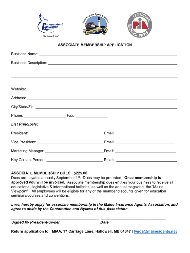 ASSOCIATE MEMBERSHIP APPLICATION Business Name: ___ Business Description: ___ ___ ___ ___ ___ Website: ___ Address: ___ City/State/Zip: ___ Phone: ___ Fax: ___ List Principals: President: ___Email: