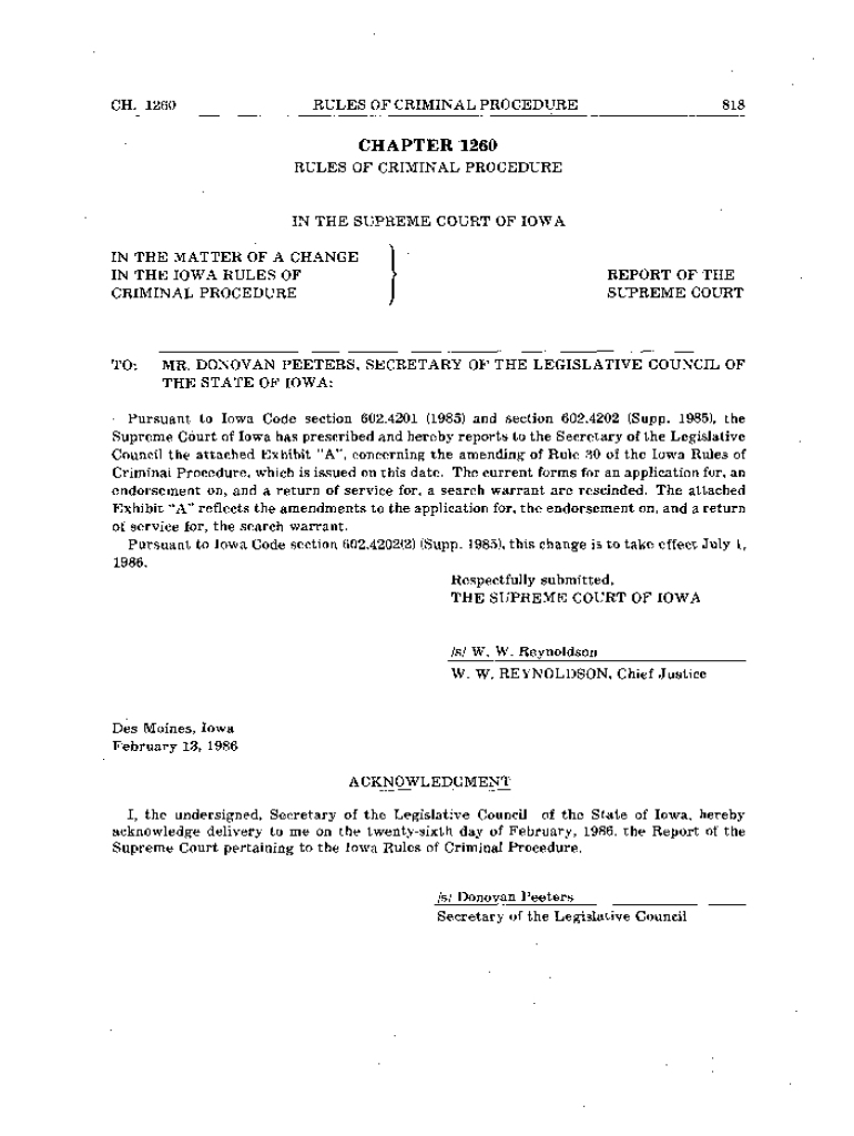CH. 1260RULES OF CRIMINAL PROCEDURE818CHAPTER 1260 RULES OF CRIMINAL PROCEDURE IN THE SUPREME COURT OF IOWA IN THE MATTER OF A CHANGE IN THE IOWA RULES OF CRIMINAL PROCEDURE TO:REPORT OF THE SUPREME