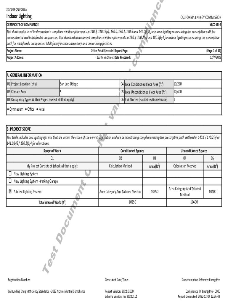 State OF CALIFORNIACALIFORNIA ENERGY COMMISSIONiaIndoor Lighting CERTIFICATE OF COMPLIANCENRCCLTIEProject Name:Office Retail Remodel Report Page:(Page 1 of 17)123 Main Street Date Prepared:12/7/2022rcProject