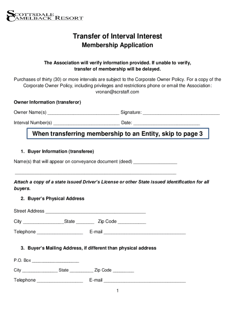 Transfer of Interval Interest Membership Application The Association will verify information provided. If unable to verify, transfer of membership will be delayed. Purchases of thirty (30) or more