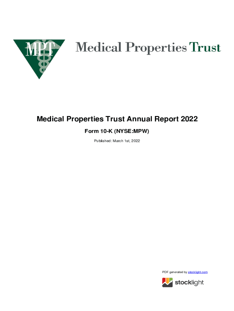 Medical Properties Trust Annual Report 2022 Form 10K (NYSE:MPH) Published: March 1st, 2022PDF generated by stock light. Counted STATES SECURITIES AND EXCHANGE COMMISSION Washington, D.C. 20549FORM