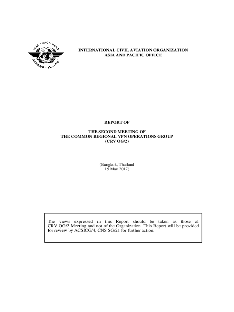 INTERNATIONAL CIVIL AVIATION ORGANIZATION ASIA AND PACIFIC OFFICEREPORT OF THE SECOND MEETING OF THE COMMON REGIONAL VPN OPERATIONS GROUP (CTV OG/2)(Bangkok, Thailand 15 May 2017)The views expressed