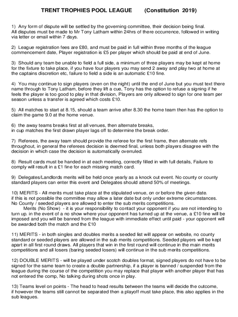 TRENT TROPHIES POOL LEAGUE(Constitution 2019)1) Any form of dispute will be settled by the governing committee, their decision being final. All disputes must be made to Mr Tony Latham within 24hrs