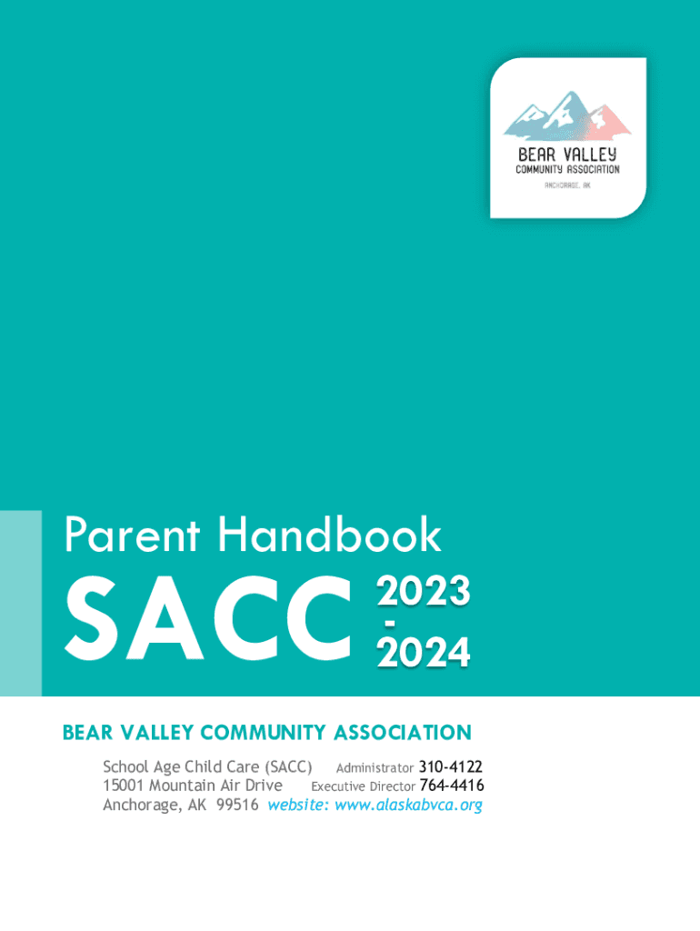 Parent HandbookSACC2023 2024BEAR VALLEY COMMUNITY ASSOCIATION School Age Child Care (SACK) Administrator 3104122 15001 Mountain Air Drive Executive Director 7644416 Anchorage, AK 99516 website: www.alaskabvca.orgSACC