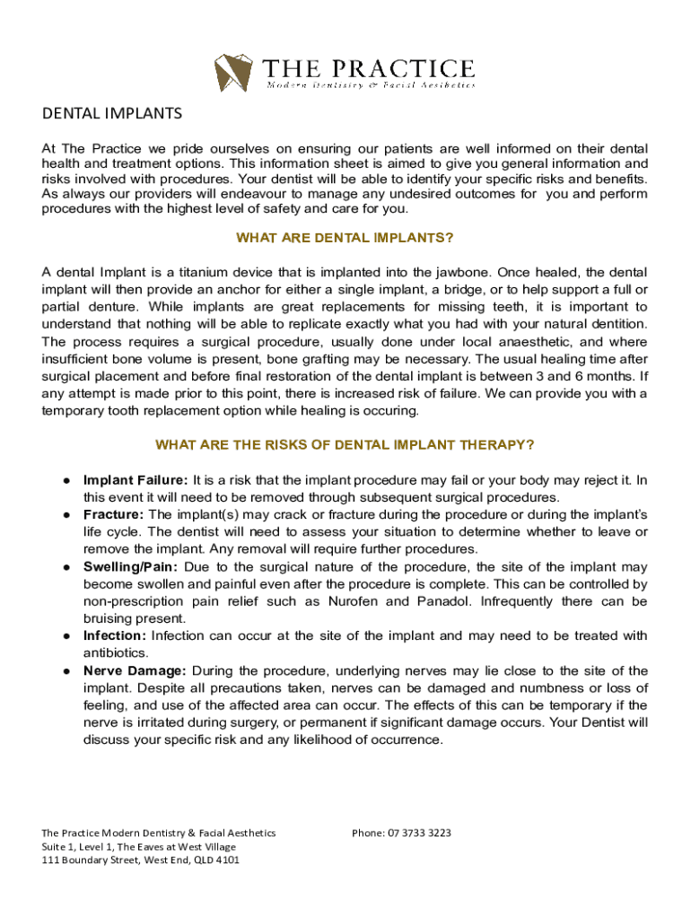 DENTAL IMPLANTS At The Practice we pride ourselves on ensuring our patients are well-informed on their dental health and treatment options. This information sheet is aimed to give you general information