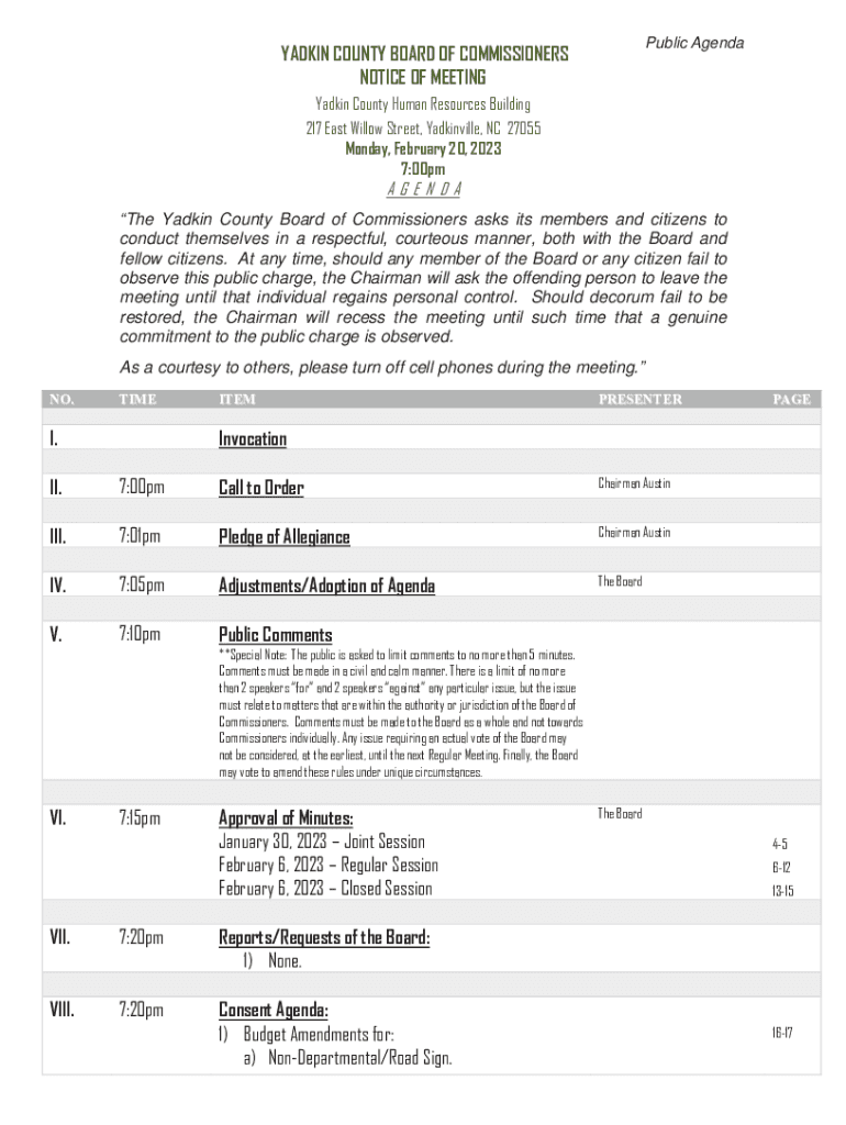 Public AgendaYADKIN COUNTY BOARD OF COMMISSIONERSNOTICE OF MEETING