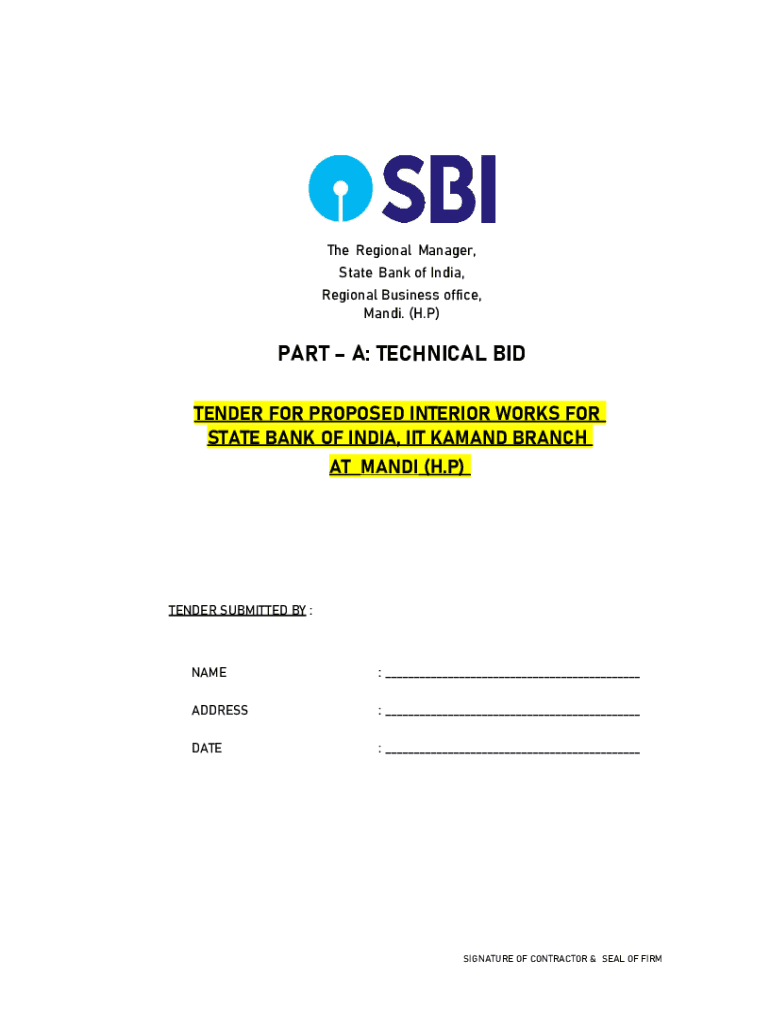 The Regional Manager, State Bank of India, Regional Business office, Mandy. (H. P)PART A: TECHNICAL BID TENDER FOR PROPOSED INTERIOR WORKS FOR STATE BANK OF INDIA, IIT DEMAND BRANCH AT MANDY (H. P)TENDER