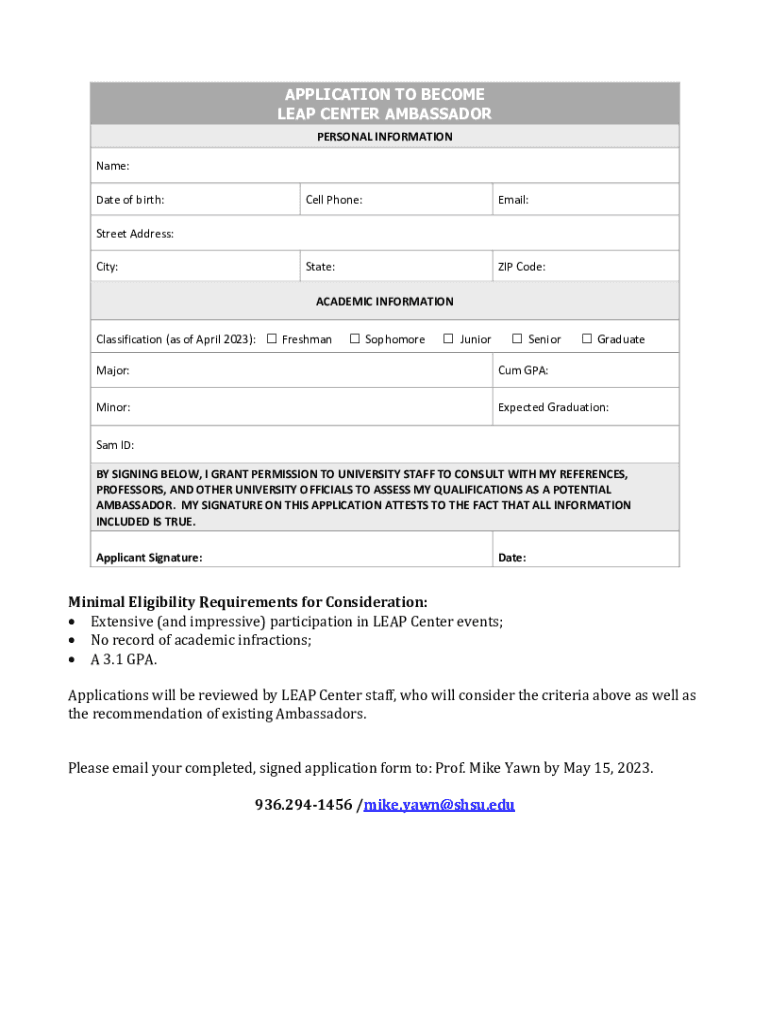 APPLICATION TO BECOME LEAP CENTER AMBASSADOR PERSONAL INFORMATION Name: Date of birth:Cell Phone:Email:State:ZIP Code:Street Address: City:ACADEMIC INFORMATION Classification (as of April 2023): Freshman