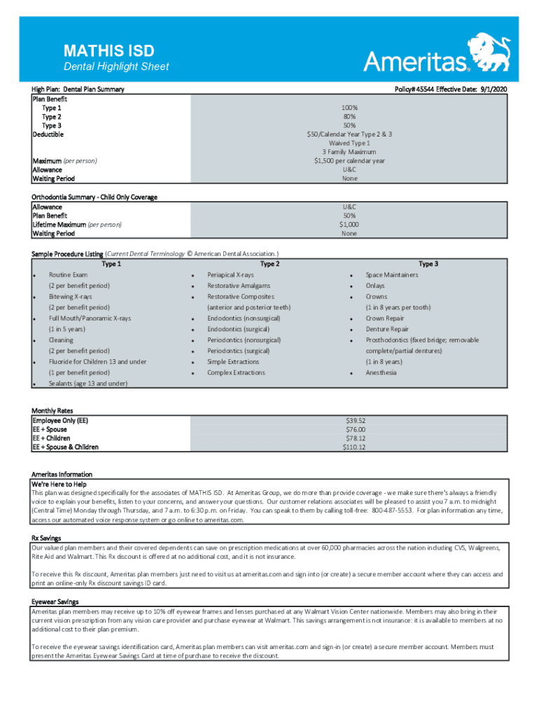 MATHIS ISD Dental Highlight Sheet High Plan: Dental Plan Summary Plan Benefit Type 1 Type 2 Type 3 Deductible Maximum (per person) Allowance Waiting Period Orthodontia Summary Child Only Coverage