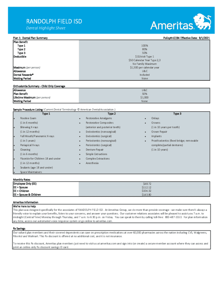 RANDOLPH FIELD ISD Dental Highlight Sheet Plan 1: Dental Plan Summary Plan Benefit Type 1 Type 2 Type 3 Deductible Maximum (per person) Allowance Dental Rewards Waiting Period Orthodontia Summary