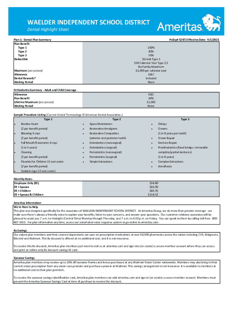 WELDER INDEPENDENT SCHOOL DISTRICT Dental Highlight Sheet Plan 1: Dental Plan Summary Plan Benefit Type 1 Type 2 Type 3 Deductible Maximum (per person) Allowance Dental Rewards Waiting Period Orthodontia