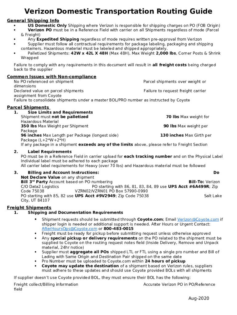 Instructions for the form Verizon Domestic Transportation Routing Guide