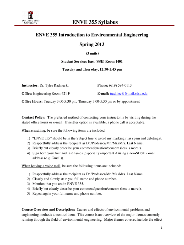 EVE 355 Syllabus EVE 355 Introduction to Environmental Engineering Spring 2013 (3 units) Student Services East (SSE) Room 1401 Tuesday and Thursday, 12:301:45 instructor: Dr. Tyler RadnieckiPhone: