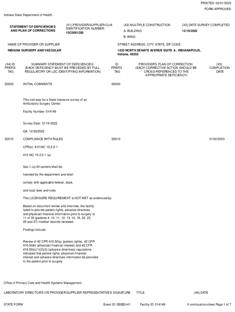 Indiana State Department of HealthSTATEMENT OF DEFICIENCIES