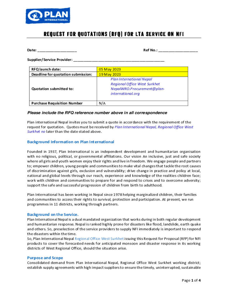 Date: ___Ref No.: ___Supplier/Service Provider: ___ RFQ launch date: Deadline for quotation submission:Quotation submitted to:Purchase Requisition Number05 May 2023 19 May 2023 Plan International