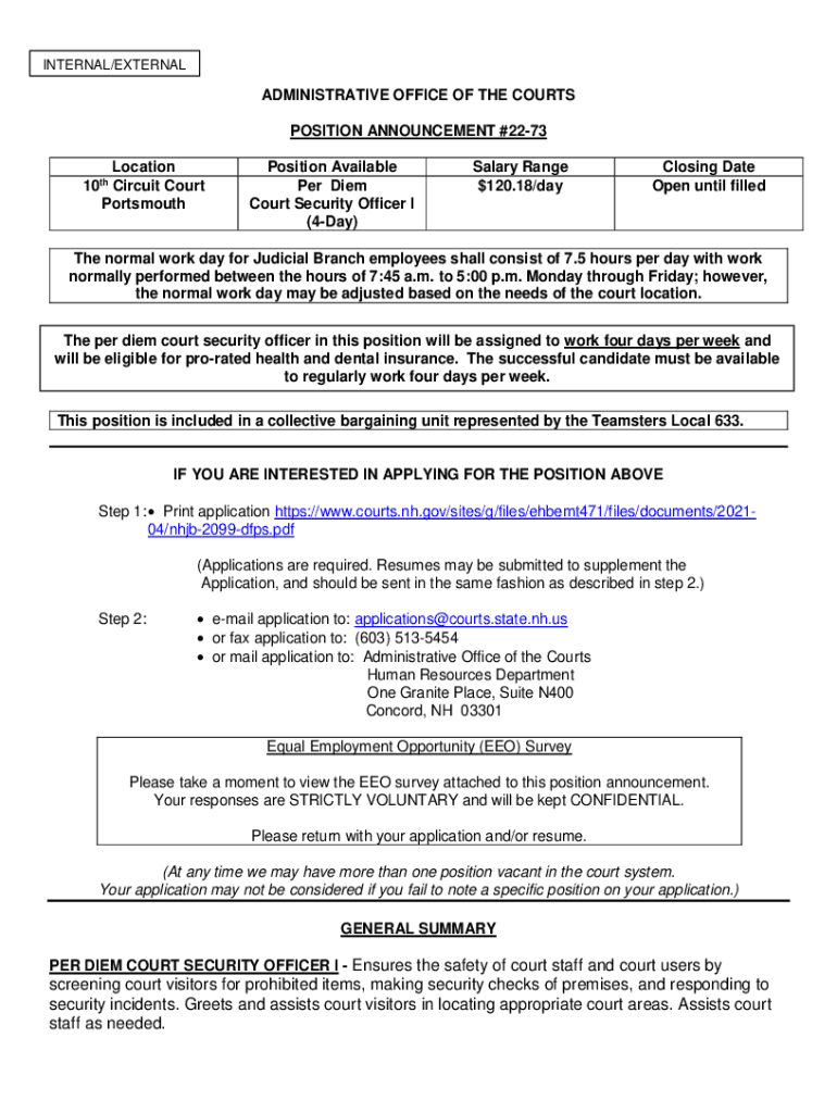 INTERNAL/EXTERNALADMINISTRATIVE OFFICE OF THE COURTS POSITION ANNOUNCEMENT #2273 Location 10th Circuit Court PortsmouthPosition Available Per Diem Court Security Officer I (4Day)Salary Range $120.18/disclosing