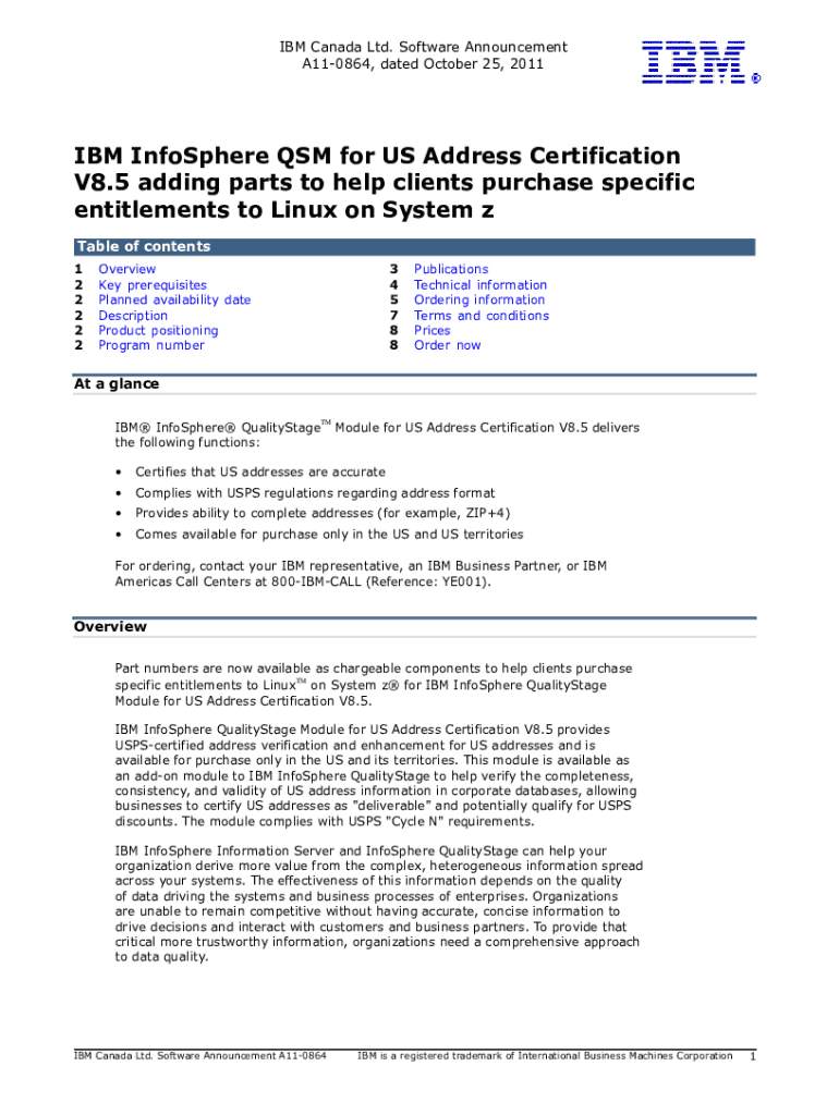 IBM Canada Ltd. Software Announcement A110864, dated October 25, 2011IBM InfoSphere DSM for US Address Certification V8.5 adding parts to help clients purchase specific entitlements to Linux on System