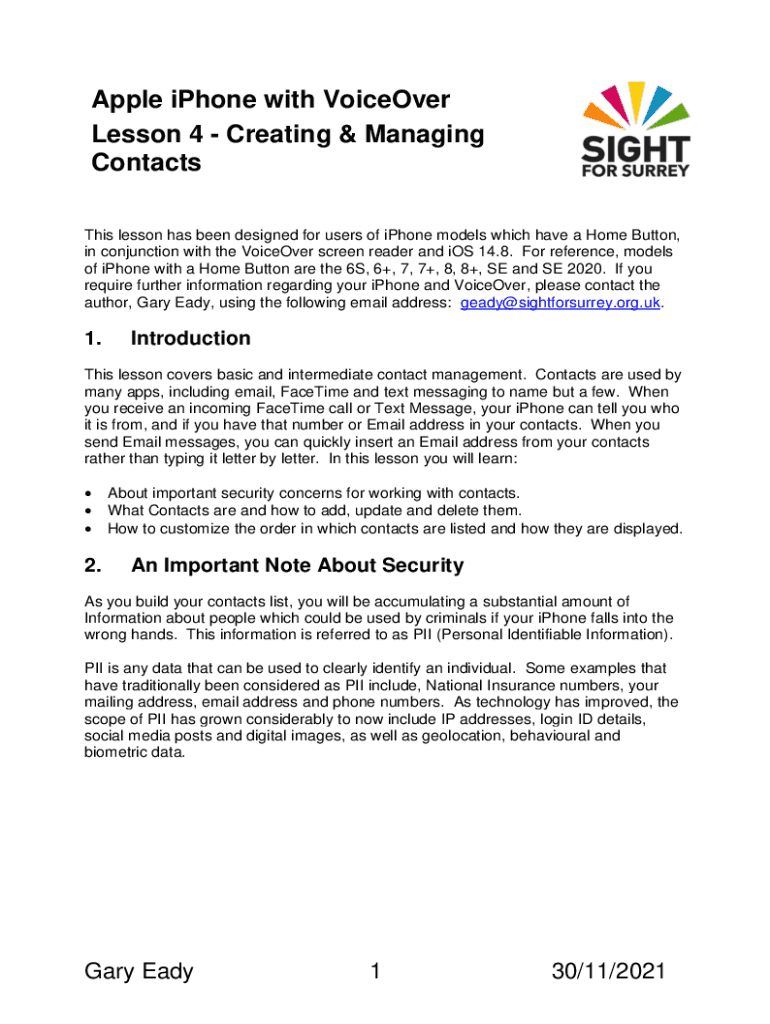 Apple iPhone with Voice-over Lesson 4 Creating & Managing Contacts This lesson has been designed for users of iPhone models which have a Home Button, in conjunction with the Voice-over screen reader
