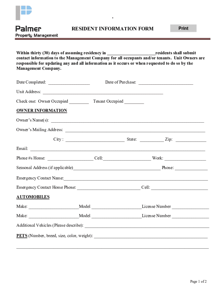 . RESIDENT INFORMATION FORMPrintWithin thirty (30) days of assuming residency in ___residents shall submit contact information to the Management Company for all occupants and/or tenants. Unit Owners
