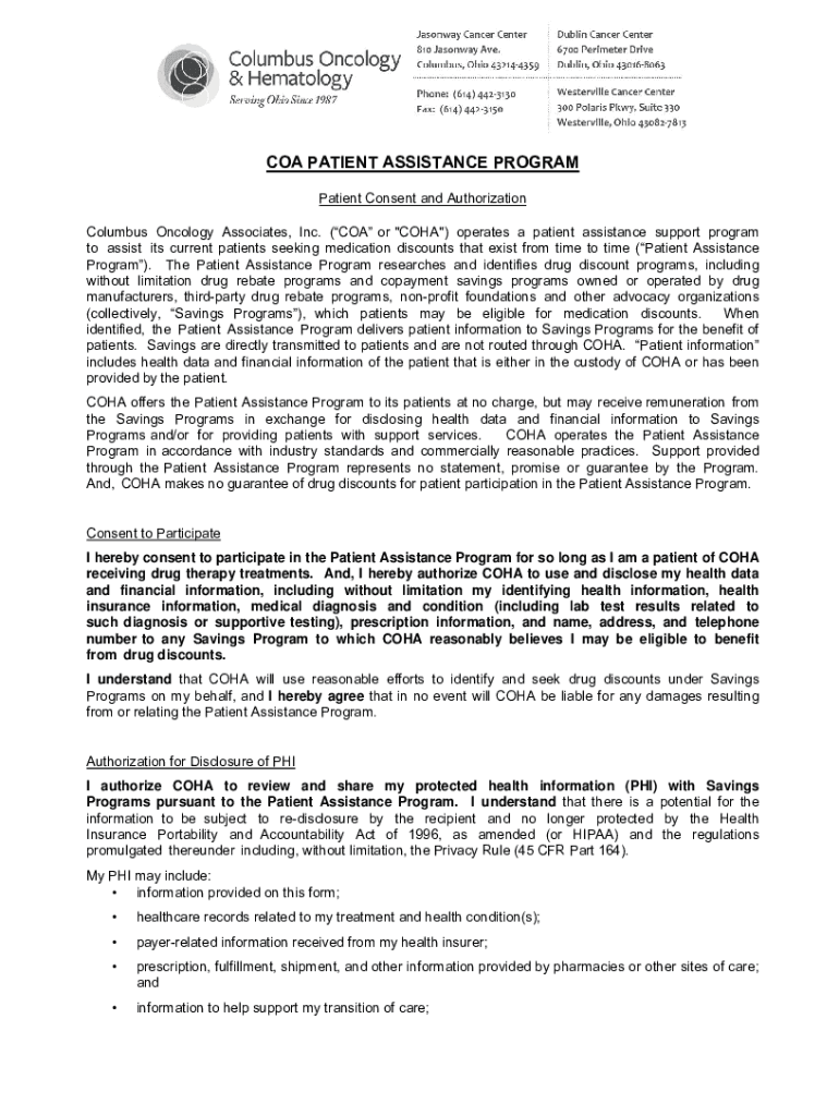 COA PATIENT ASSISTANCE PROGRAM Patient Consent and Authorization Columbus Oncology Associates, Inc. (COA or \” COMA\”) operates a patient assistance support program to assist its current patients