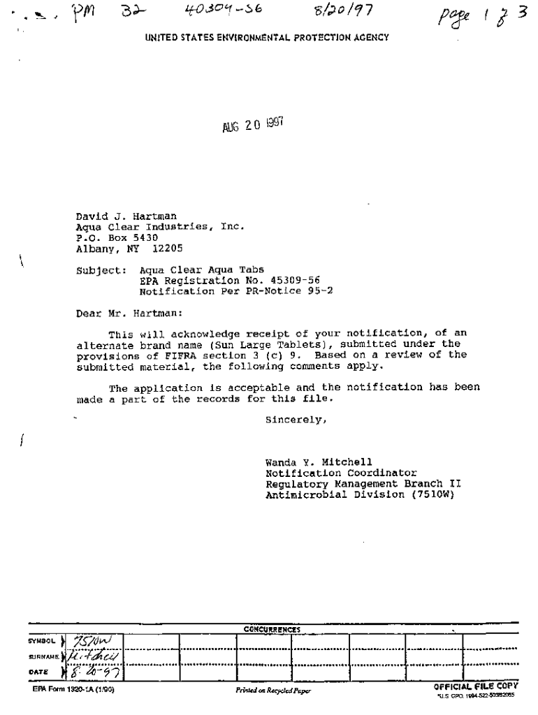 F,.(13UNITED STATES ENVIRONMENTAL PROTECTION AGENCY AUG 2 0 991David J. Hartman Aqua Clear Industries, Inc. P.O. Box 5430 Albany, NY 12205Subject:Aqua Clear Aqua Tabs EPA Registration No. 4530956