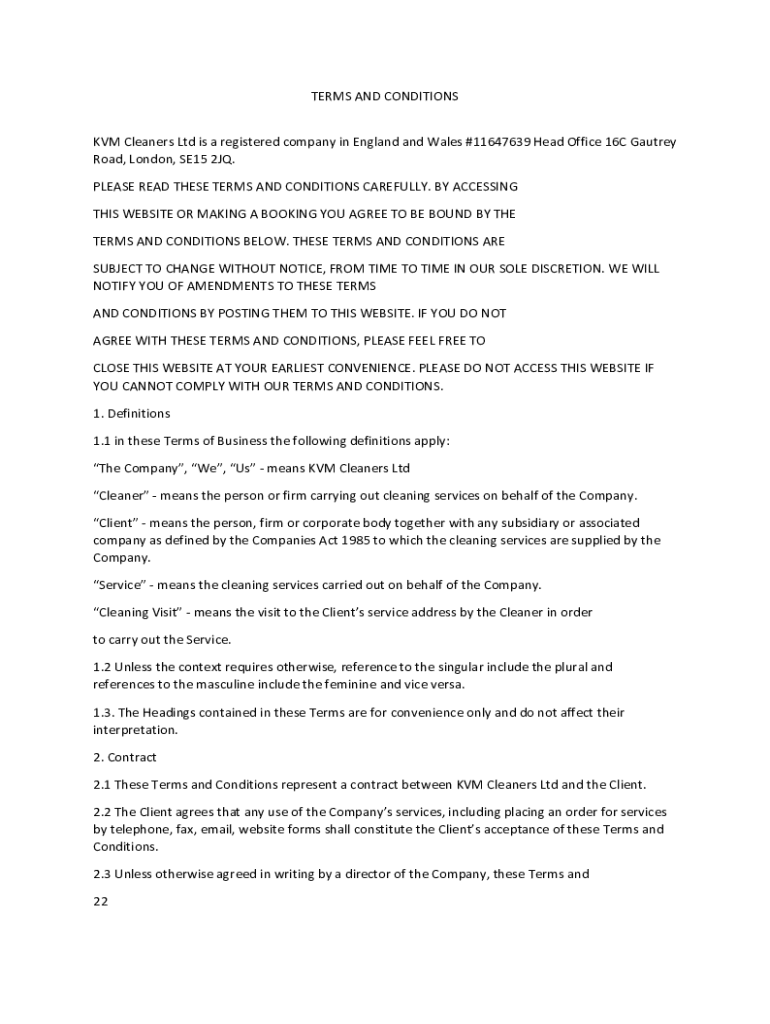 TERMS AND CONDITIONS KVM Cleaners Ltd is a registered company in England and Wales #11647639 Head Office 16C Mantra Road, London, SE15 2JQ. PLEASE READ THESE TERMS AND CONDITIONS CAREFULLY. BY ACCESSING