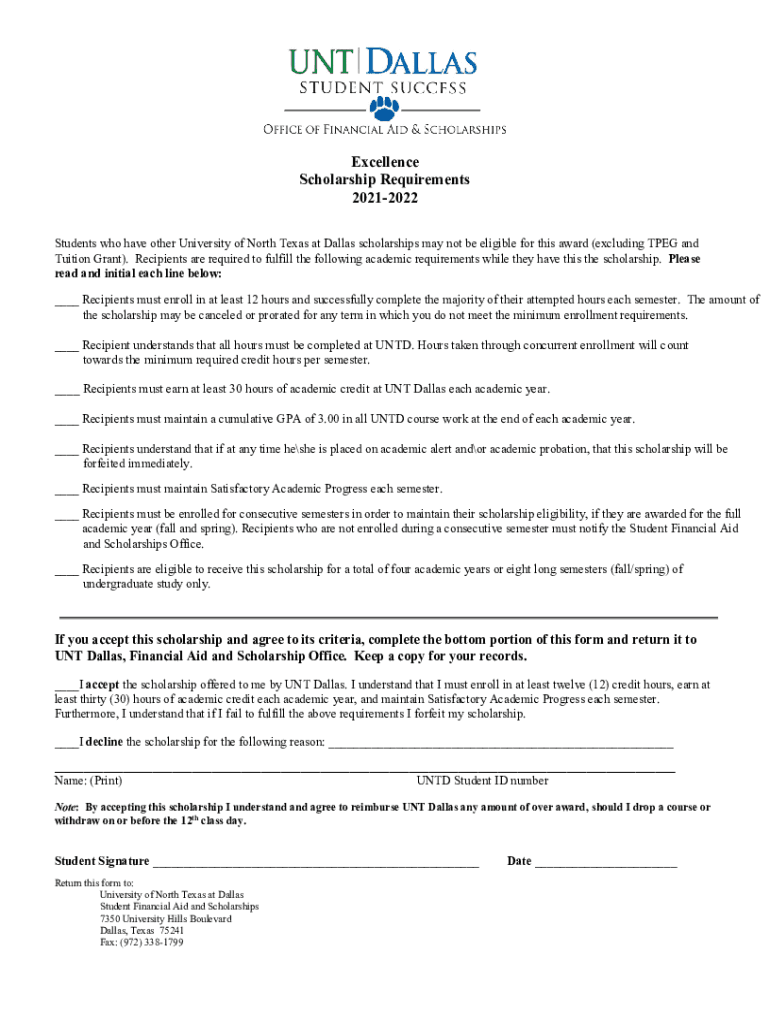 Excellence Scholarship Requirements 20212022 Students who have other University of North Texas at Dallas scholarships may not be eligible for this award (excluding PEG and Tuition Grant). Recipients