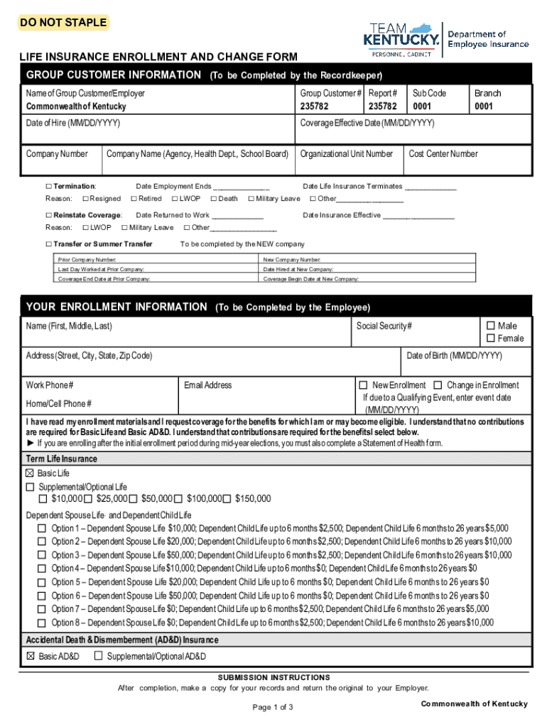 DO NOT STAPLE LIFE INSURANCE ENROLLMENT AND CHANGE FORM GROUP CUSTOMER INFORMATION (To be Completed by the Record keeper) Name of Group Customer/Employer Commonwealth of KentuckyGroup Customer # Report