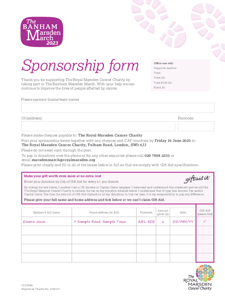 Get the free Sponsorship form Office use only - Royal Marsden Big C - bigc ...