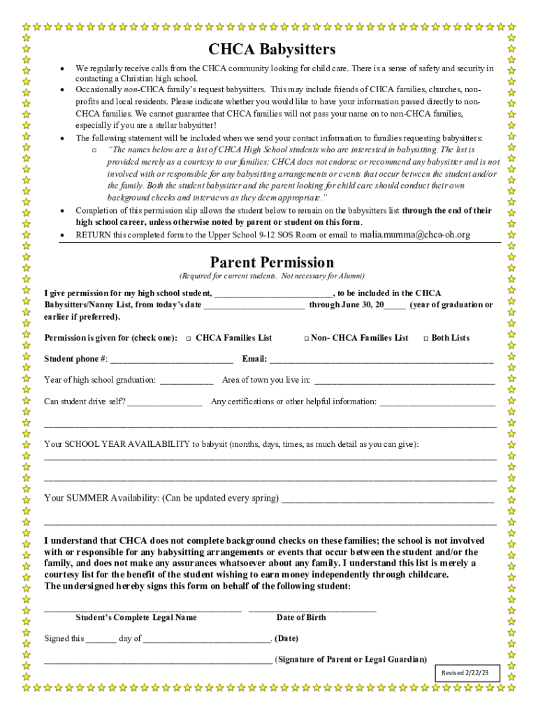 CCA Babysitters We regularly receive calls from the CCA community looking for child care. There is a sense of safety and security in contacting a Christian high school. Occasionally Concha families