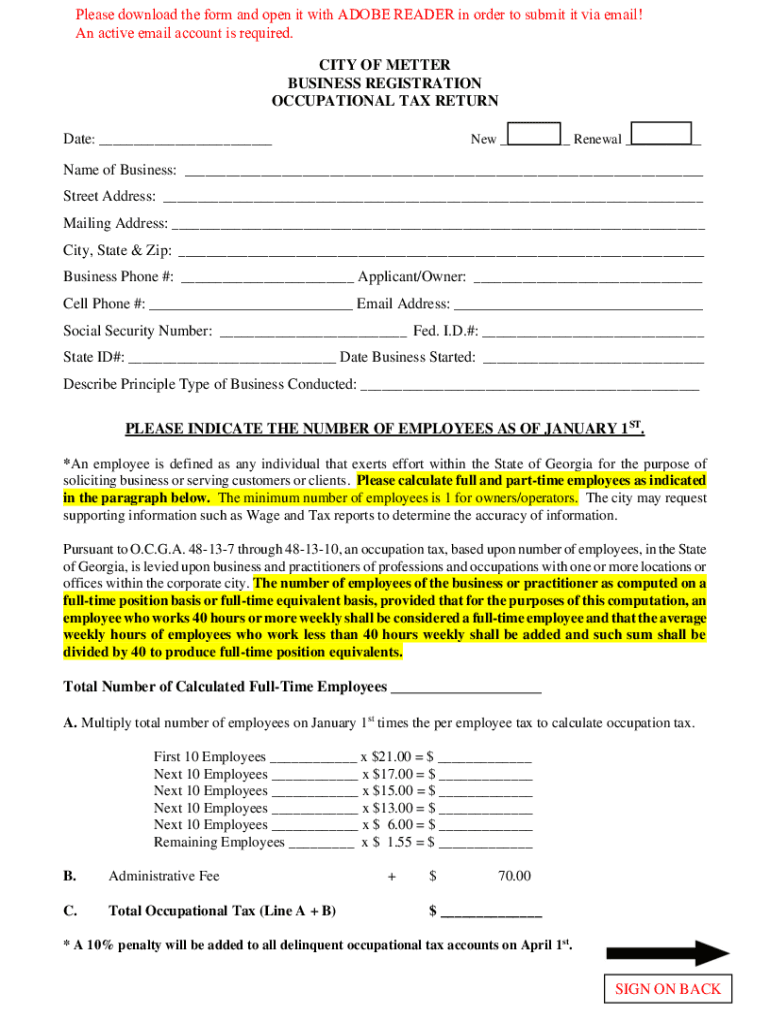 Please download the form and open it with ADOBE READER in order to submit it via email! An active email account is required. CITY OF BETTER BUSINESS REGISTRATION OCCUPATIONAL TAX RETURN Date: ___New