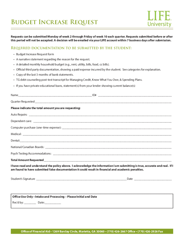 Office of Financial Aid Budget Increase Policy In compliance with federal guidelines, the Office of Financial Aid has determined a cost of attendance that includes tuition, fees, books and supplies,
