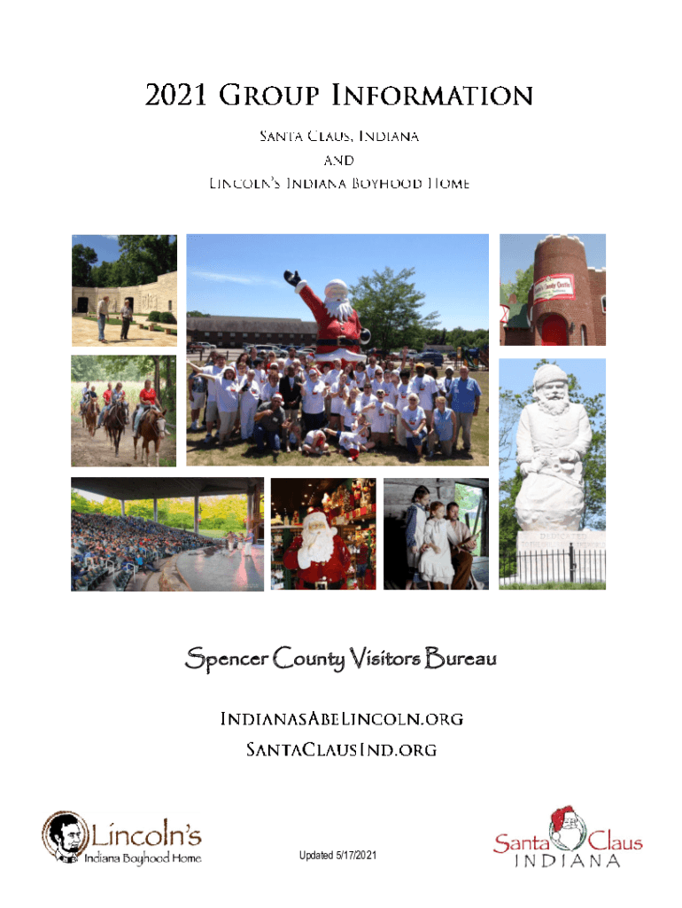 Spencer County Visitors BureauUpdated 5/17/202123Page # Welcome5Resources7Hours9Getting Here11Santa Claus, Indiana Fact Sheet1314Lincolns Indiana Boyhood Home Fact Sheet1516Attractions Santa Claus1725Attractions