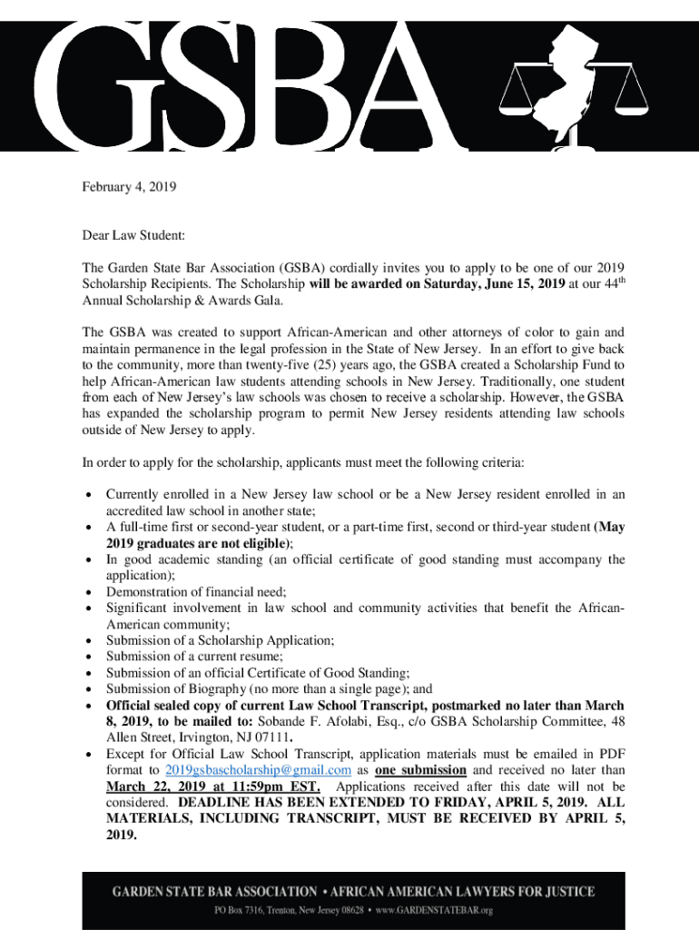 February 4, 2019Dear Law Student: The Garden State Bar Association (GBA) cordially invites you to apply to be one of our 2019 Scholarship Recipients. The Scholarship will be awarded on Saturday, June