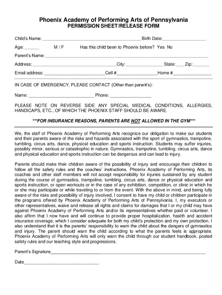 Phoenix Academy of Performing Arts of Pennsylvania PERMISSION SHEET/RELEASE FORM Child's Name: ___ Birth Date:___ Age: ___M/Has this child been to Phoenix before? Yes Parents Name: ___ Address: ___City: