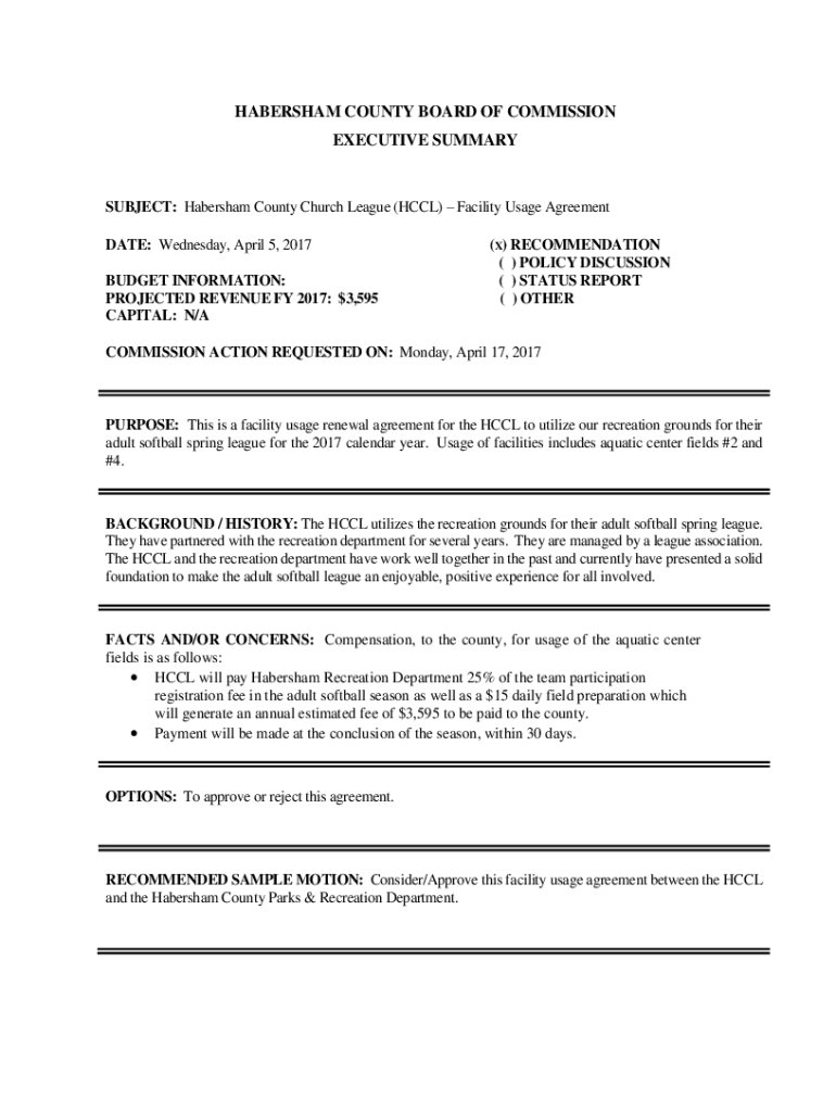 ABRAHAM COUNTY BOARD OF COMMISSION EXECUTIVE SUMMARYSUBJECT: Haber sham County Church League (HCC) Facility Usage Agreement DATE: Wednesday, April 5, 2017, BUDGET INFORMATION: PROJECTED REVENUE FY